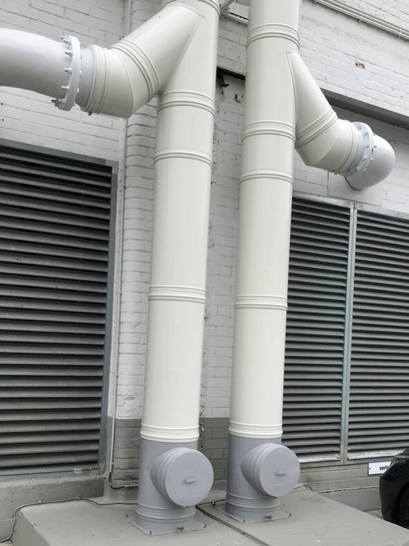 Die Abgassysteme für Generatoren und Notstromaggregate sind russbrandbeständig oder feuchteunempfindlich, sodass diese in Krankenhäusern oder in der Datenverarbeitungsbranche zum Einsatz kommen, wo der Ausfall des Stromnetzes gravierende Auswirkungen zur Folge hat.
